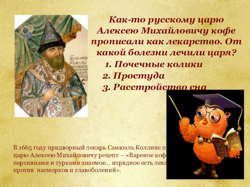 Как-то русскому царю Алексею Михайловичу кофе прописали как лекарство. От какой болезни лечили царя?