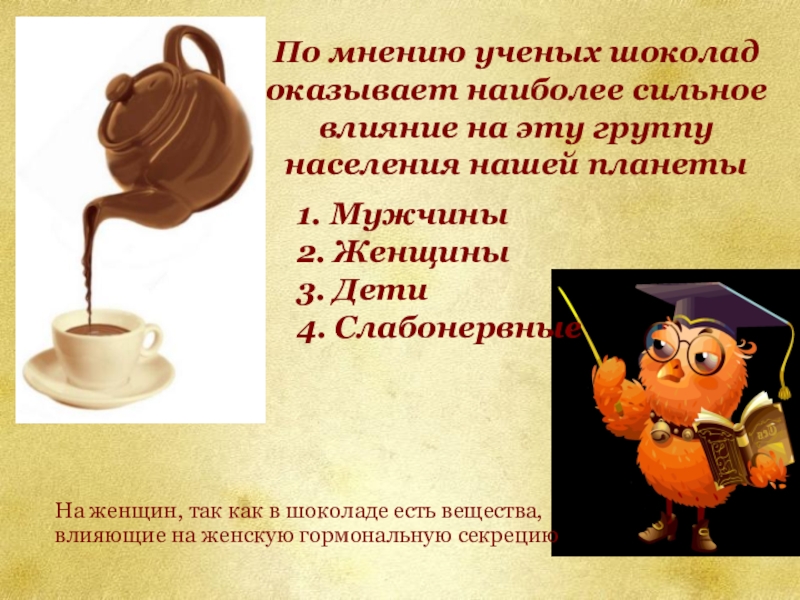 На женщин, так как в шоколаде есть вещества, влияющие на женскую гормональную секрецию