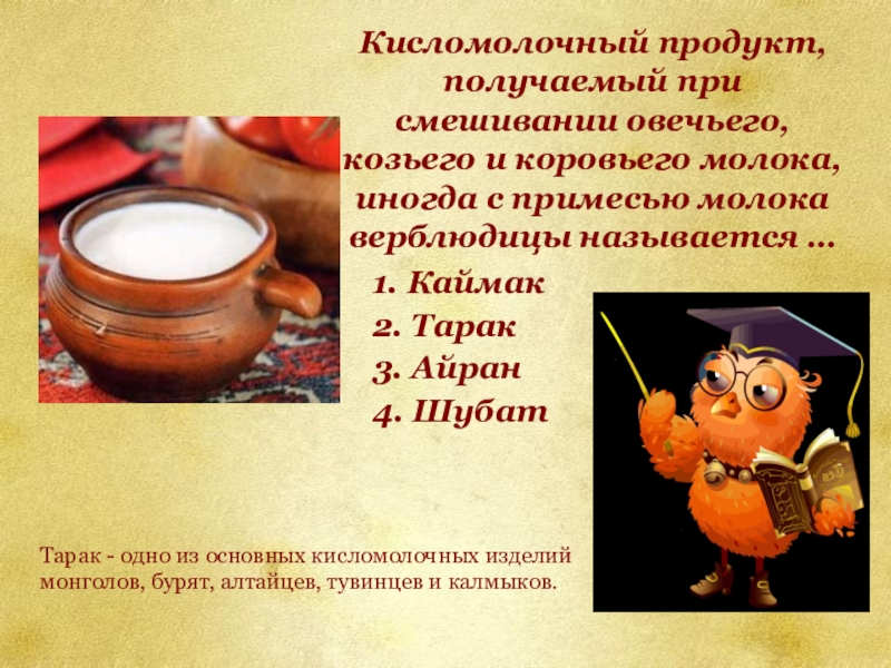 Тарак - одно из основных кисломолочных изделий монголов, бурят, алтайцев, тувинцев и калмыков.