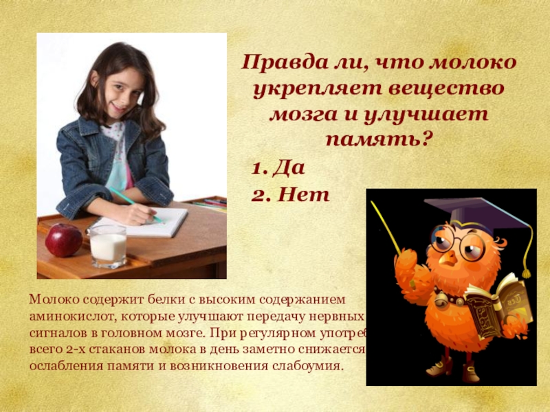 Молоко содержит белки с высоким содержанием аминокислот, которые улучшают передачу нервных сигналов в головном мозге. При регулярном употреблении всего 2-х стаканов молока в день заметно снижается риск ослабления памяти и возникновения слабоумия.