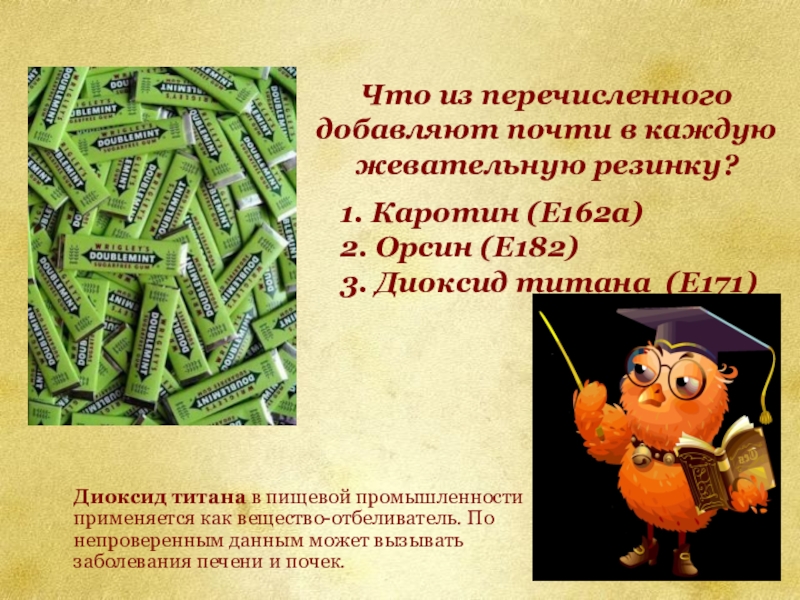 Диоксид титана в пищевой промышленности применяется как вещество-отбеливатель. По непроверенным данным может вызывать заболевания печени и почек.