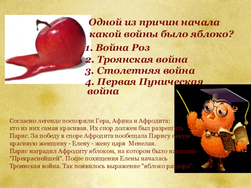 "Прекраснейшей". После похищения Елены началась Троянская война. Так появилось выражение "яблоко раздора".