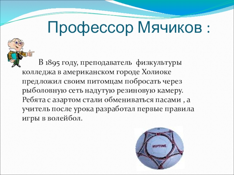 В 1895 году, преподаватель физкультуры колледжа в американском городе Холиоке предложил своим питомцам побросать через рыболовную сеть надутую резиновую камеру. Ребята с азартом стали обмениваться пасами , а учитель после урока разработал первые правила игры в волейбол.