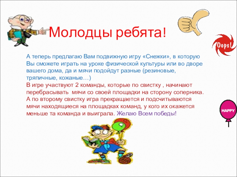 А теперь предлагаю Вам подвижную игру «Снежки», в которую