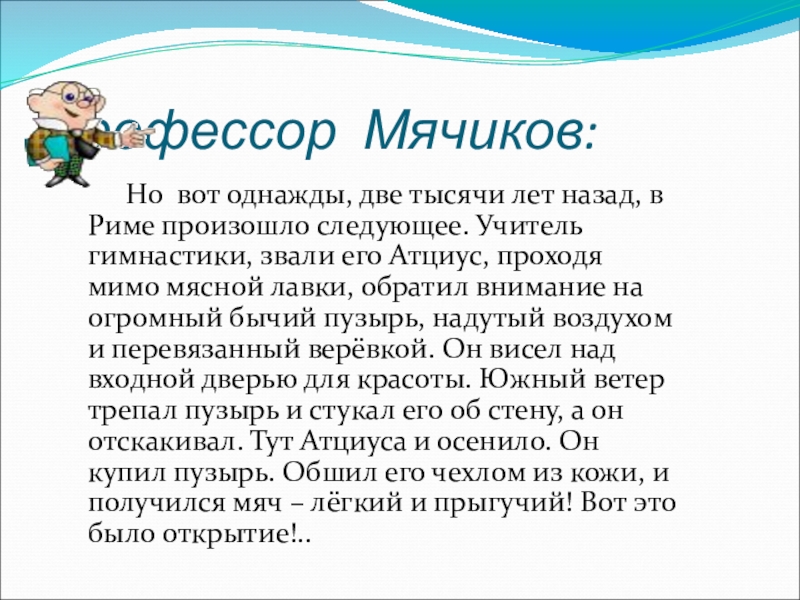 лет назад, в Риме произошло следующее. Учитель гимнастики, звали его Атциус, проходя мимо мясной лавки, обратил внимание на огромный бычий пузырь, надутый воздухом и перевязанный верёвкой. Он висел над входной дверью для красоты. Южный ветер трепал пузырь и стукал его об стену, а он отскакивал. Тут Атциуса и осенило. Он купил пузырь. Обшил его чехлом из кожи, и получился мяч – лёгкий и прыгучий! Вот это было открытие!..