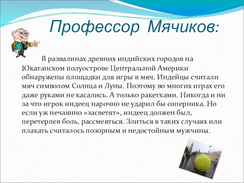 индийских городов на Юкатанском полуострове Центральной Америки обнаружены площадки для игры в мяч. Индейцы считали мяч символом Солнца и Луны. Поэтому во многих играх его даже руками не касались. А только ракетками. Никогда и ни за что игрок индеец нарочно не ударил бы соперника. Но если уж нечаянно «засветят», индеец должен был, перетерпев боль, рассмеяться. Злиться в таких случаях или плакать считалось позорным и недостойным мужчины.