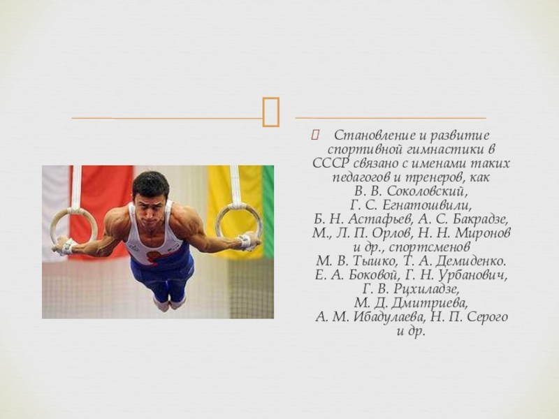 Слайд 7Становление и развитие спортивной гимнастики в СССР связано с именами таких