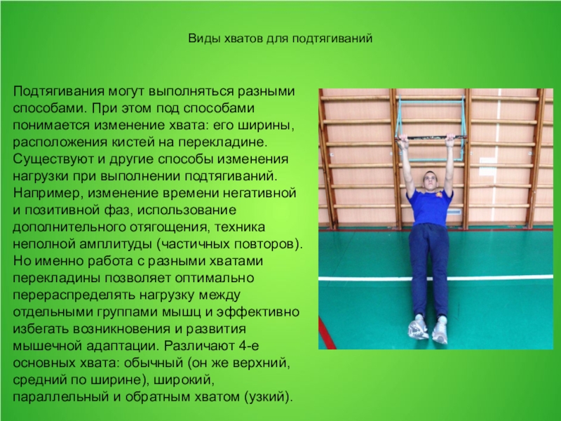 способами понимается изменение хвата: его ширины, расположения кистей на перекладине. Существуют и другие способы изменения нагрузки при выполнении подтягиваний. Например, изменение времени негативной и позитивной фаз, использование дополнительного отягощения, техника неполной амплитуды (частичных повторов). Но именно работа с разными хватами перекладины позволяет оптимально перераспределять нагрузку между отдельными группами мышц и эффективно избегать возникновения и развития мышечной адаптации. Различают 4-е основных хвата: обычный (он же верхний, средний по ширине), широкий, параллельный и обратным хватом (узкий).