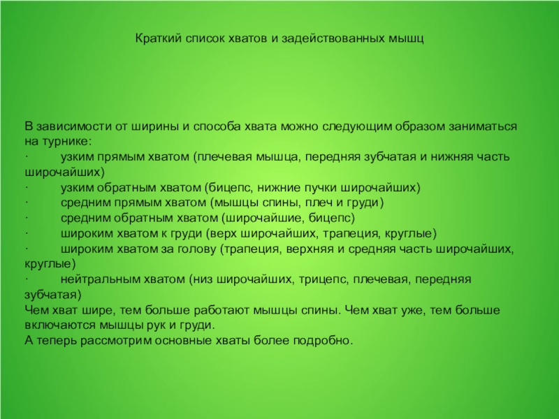 Чем хват шире, тем больше работают мышцы спины. Чем хват уже, тем больше включаются мышцы рук и груди.