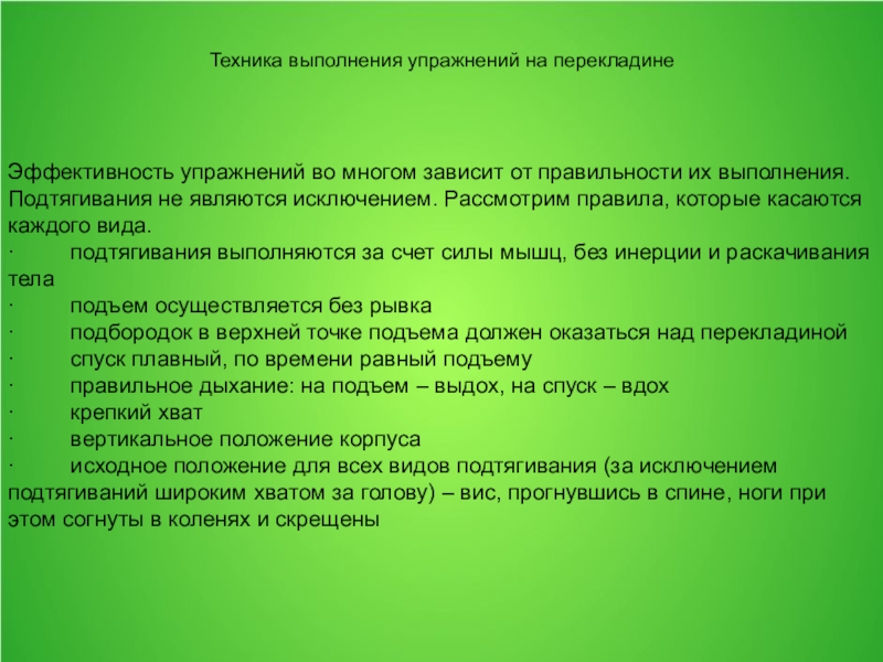 · подтягивания выполняются за счет силы мышц, без инерции и раскачивания тела