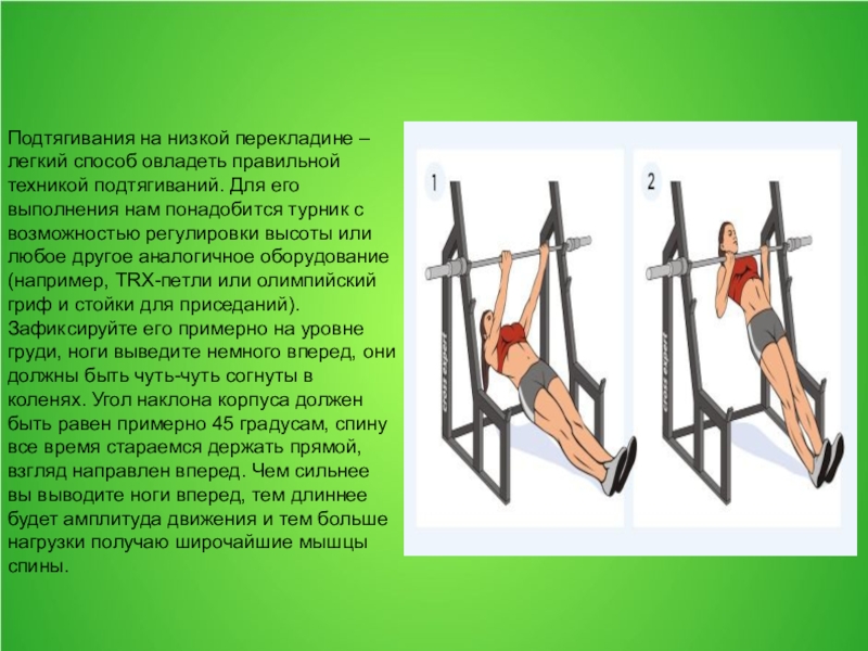 Слайд 2Подтягивания на низкой перекладине – легкий способ овладеть правильной техникой подтягиваний.