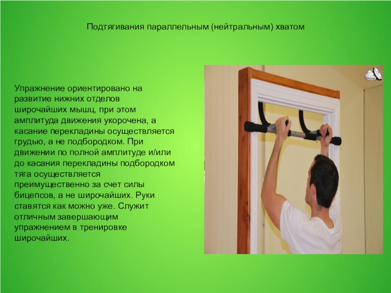 Слайд 11Подтягивания параллельным (нейтральным) хватом