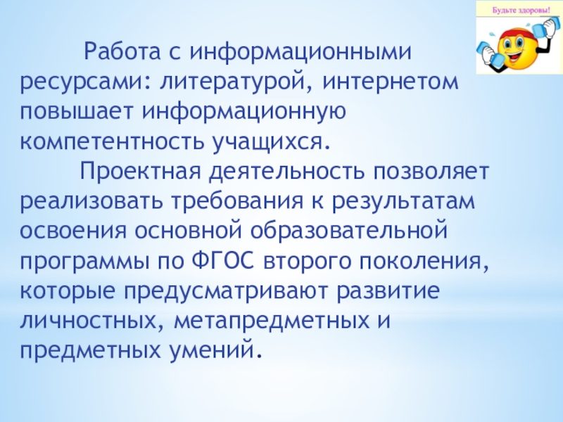 Проектная деятельность позволяет реализовать требования к результатам освоения основной образовательной программы по ФГОС второго поколения, которые предусматривают развитие личностных, метапредметных и предметных умений.