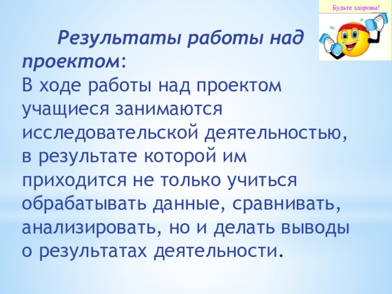 учащиеся занимаются исследовательской деятельностью, в результате которой им приходится не только учиться обрабатывать данные, сравнивать, анализировать, но и делать выводы о результатах деятельности.