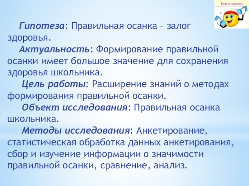Методы исследования: Анкетирование, статистическая обработка данных анкетирования, сбор и изучение информации о значимости правильной осанки, сравнение, анализ.