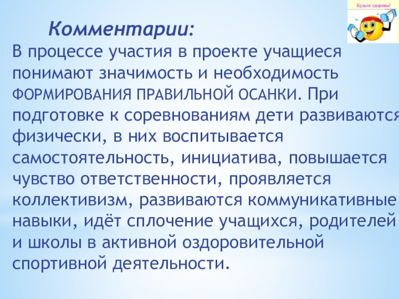 и необходимость ФОРМИРОВАНИЯ ПРАВИЛЬНОЙ ОСАНКИ. При подготовке к соревнованиям дети развиваются физически, в них воспитывается самостоятельность, инициатива, повышается чувство ответственности, проявляется коллективизм, развиваются коммуникативные навыки, идёт сплочение учащихся, родителей и школы в активной оздоровительной спортивной деятельности.