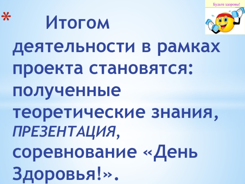полученные теоретические знания, ПРЕЗЕНТАЦИЯ, соревнование «День Здоровья!».