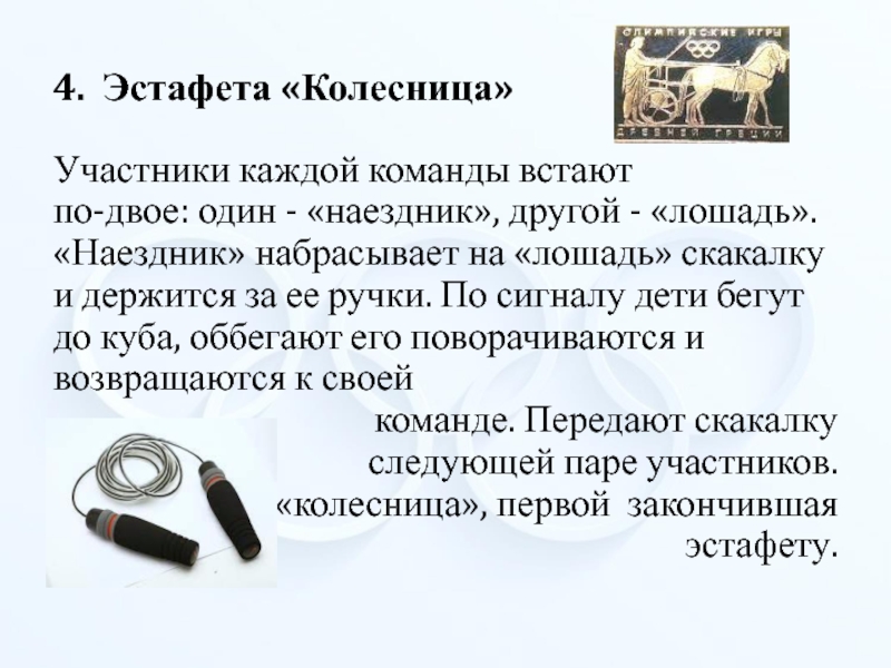 - «лошадь». «Наездник» набрасывает на «лошадь» скакалку и держится за ее ручки. По сигналу дети бегут до куба, оббегают его поворачиваются и возвращаются к своей