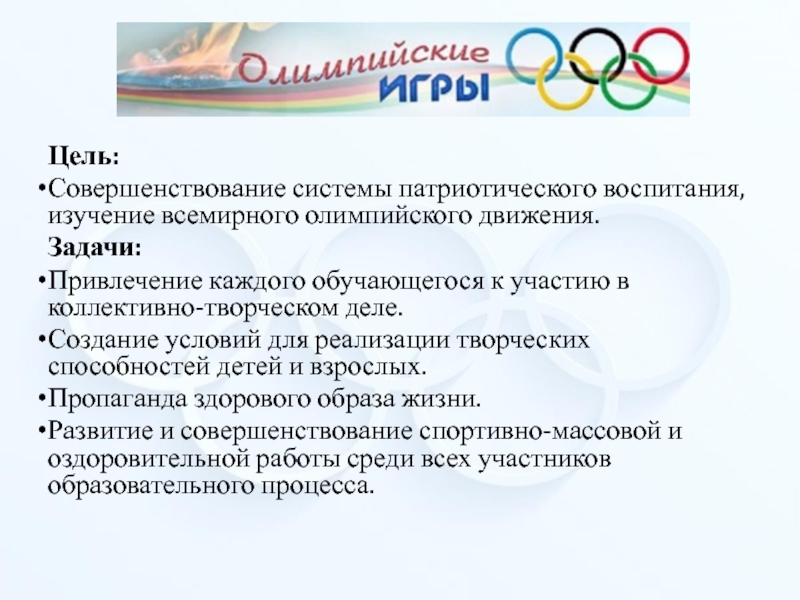 Совершенствование системы патриотического воспитания, изучение всемирного олимпийского движения.