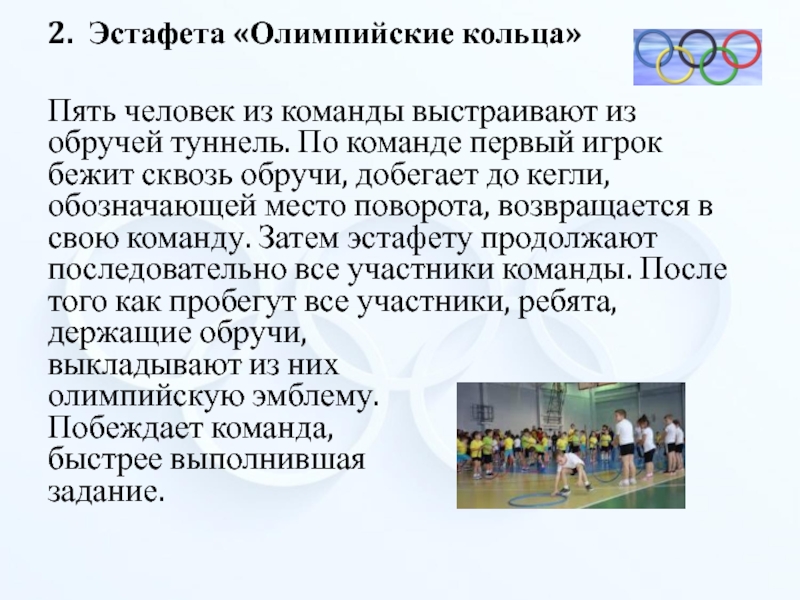 По команде первый игрок бежит сквозь обручи, добегает до кегли, обозначающей место поворота, возвращается в свою команду. Затем эстафету продолжают последовательно все участники команды. После того как пробегут все участники, ребята, держащие обручи,