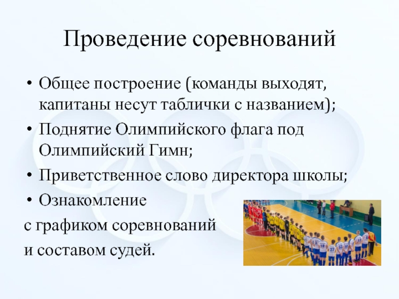 Общее построение (команды выходят, капитаны несут таблички с названием);