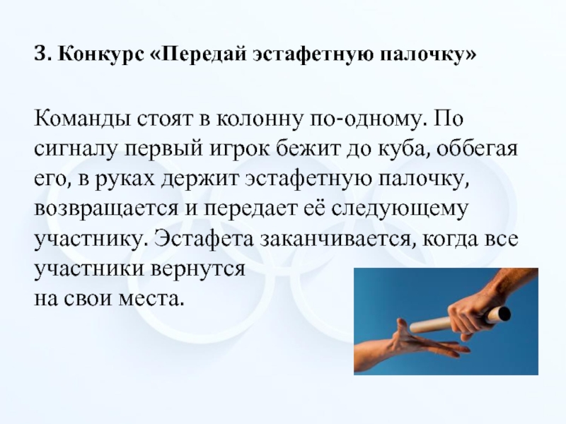 первый игрок бежит до куба, оббегая его, в руках держит эстафетную палочку, возвращается и передает её следующему участнику. Эстафета заканчивается, когда все