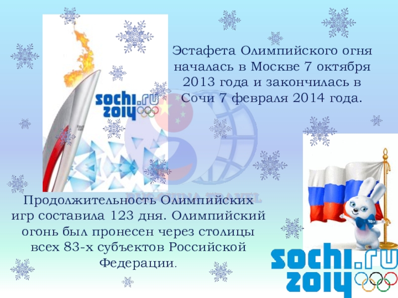 Эстафета Олимпийского огня началась в Москве 7 октября 2013 года и закончилась в Сочи 7 февраля 2014 года.