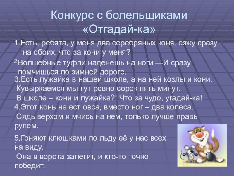 3.Есть лужайка в нашей школе, а на ней козлы и кони.