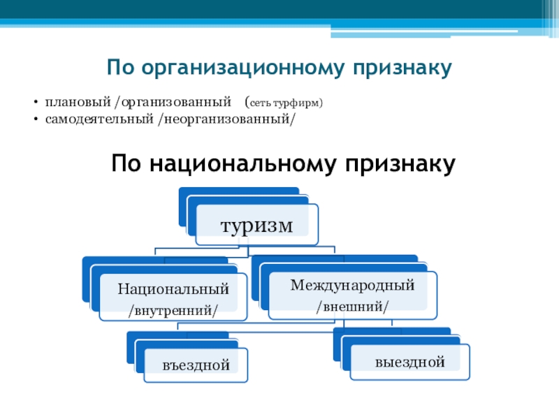 По организационному признаку По национальному признаку плановый /организованный  (сеть турфирм) самодеятельный /неорганизованный/