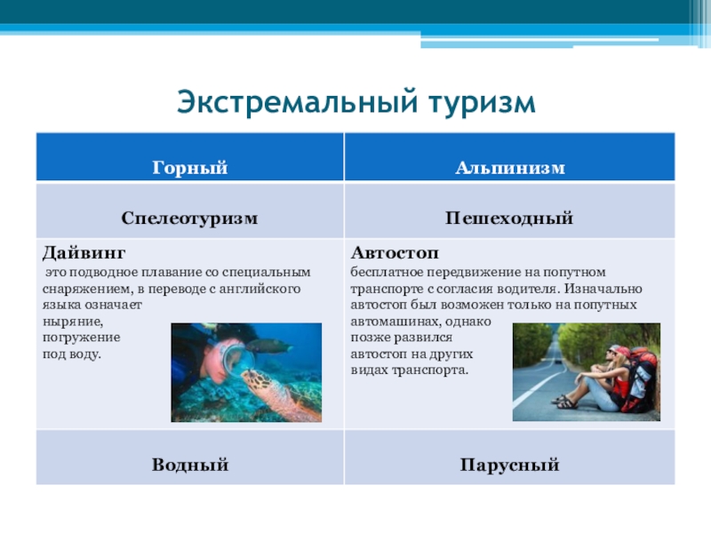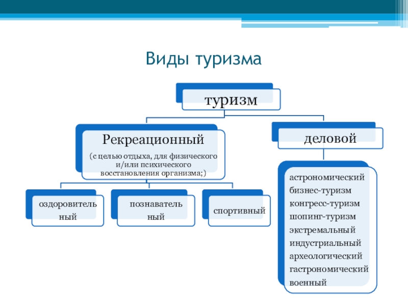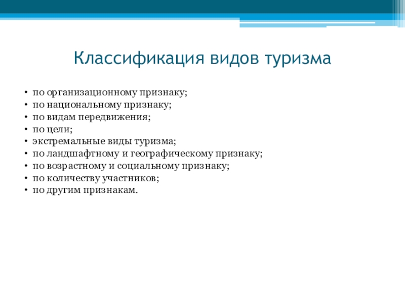 Классификация видов туризма по организационному признаку; по национальному признаку; по видам передвижения; по цели; экстремальные виды туризма;