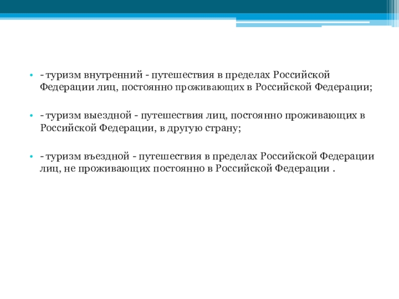 - туризм внутренний - путешествия в пределах Российской Федерации лиц, постоянно проживающих в Российской Федерации;- туризм выездной