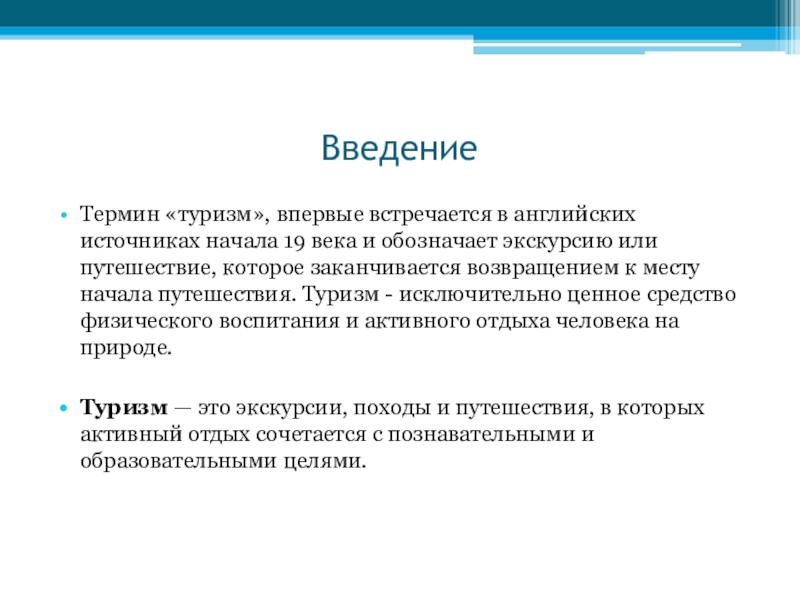ВведениеТермин «туризм», впервые встречается в английских источниках начала 19 века и обозначает экскурсию или путешествие, которое заканчивается возвращением к месту начала путешествия. Туризм - исключительно ценное средство физического воспитания и активного отдыха человека на природе.Туризм —