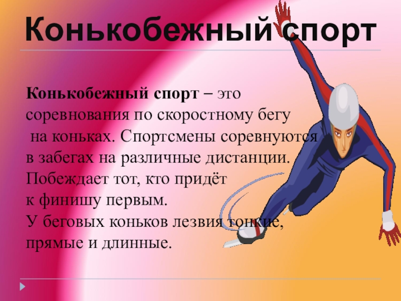 Конькобежный спортКонькобежный спорт – это соревнования по скоростному бегу на коньках. Спортсмены соревнуются в забегах на различные