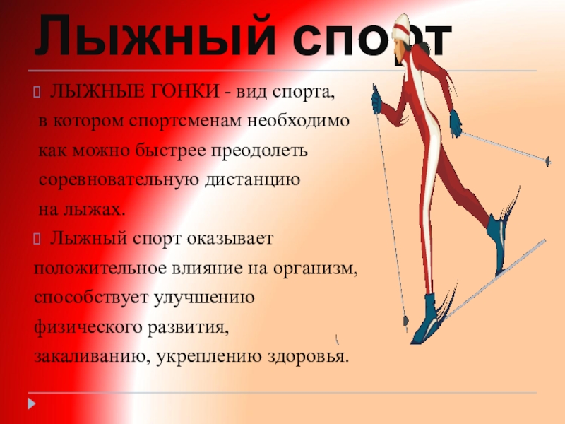 Лыжный спортЛЫЖНЫЕ ГОНКИ - вид спорта, в котором спортсменам необходимо как можно быстрее преодолеть соревновательную дистанцию на