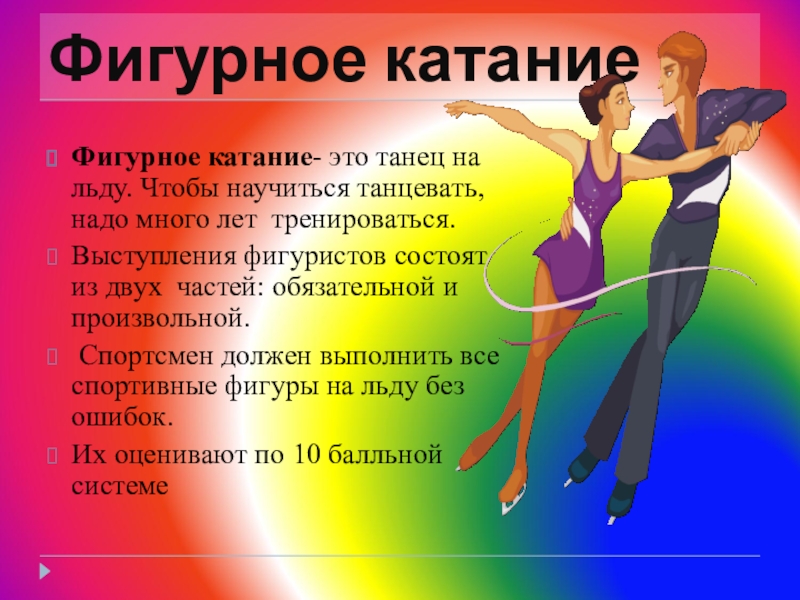 Фигурное катаниеФигурное катание- это танец на льду. Чтобы научиться танцевать, надо много лет тренироваться. Выступления фигуристов состоят