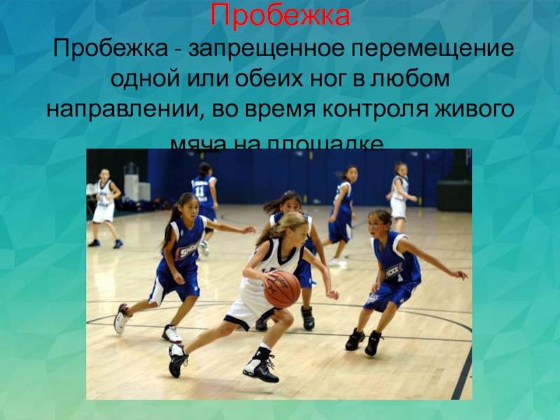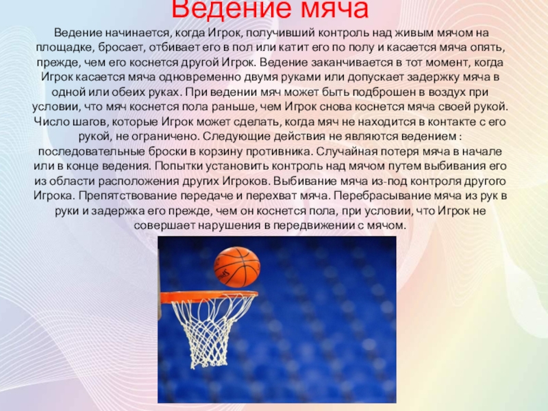 на площадке, бросает, отбивает его в пол или катит его по полу и касается мяча опять, прежде, чем его коснется другой Игрок. Ведение заканчивается в тот момент, когда Игрок касается мяча одновременно двумя руками или допускает задержку мяча в одной или обеих руках. При ведении мяч может быть подброшен в воздух при условии, что мяч коснется пола раньше, чем Игрок снова коснется мяча своей рукой. Число шагов, которые Игрок может сделать, когда мяч не находится в контакте с его рукой, не ограничено. Следующие действия не являются ведением :последовательные броски в корзину противника. Случайная потеря мяча в начале или в конце ведения. Попытки установить контроль над мячом путем выбивания его из области расположения других Игроков. Выбивание мяча из-под контроля другого Игрока. Препятствование передаче и перехват мяча. Перебрасывание мяча из рук в руки и задержка его прежде, чем он коснется пола, при условии, что Игрок не совершает нарушения в передвижении с мячом.