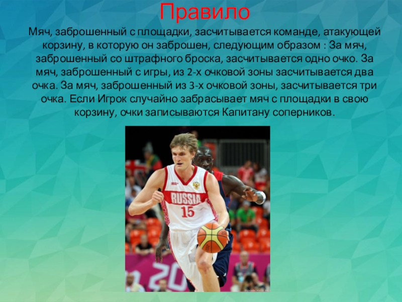 он заброшен, следующим образом : За мяч, заброшенный со штрафного броска, засчитывается одно очко. За мяч, заброшенный с игры, из 2-х очковой зоны засчитывается два очка. За мяч, заброшенный из 3-х очковой зоны, засчитывается три очка. Если Игрок случайно забрасывает мяч с площадки в свою корзину, очки записываются Капитану соперников.