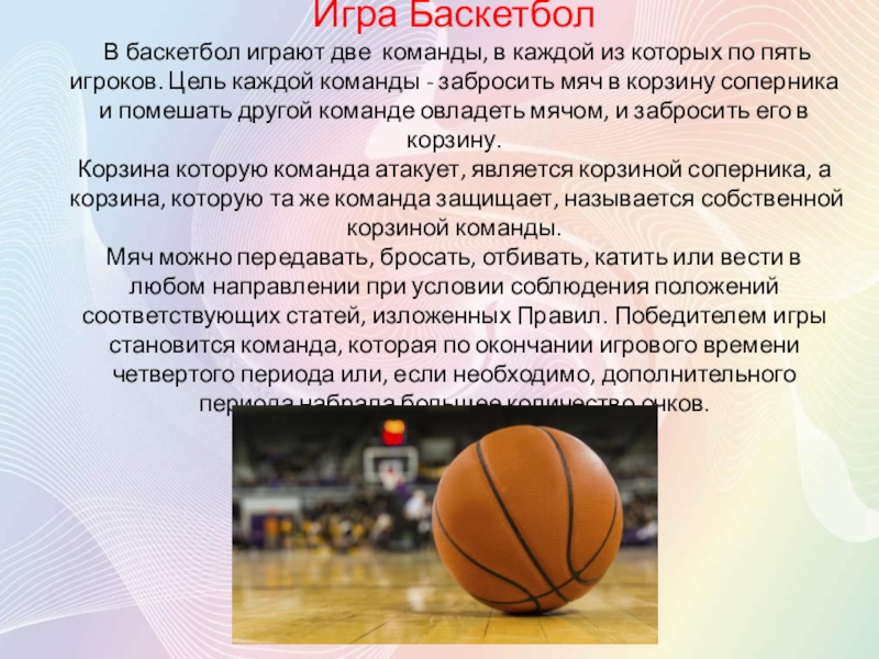 по пять игроков. Цель каждой команды - забросить мяч в корзину соперника и помешать другой команде овладеть мячом, и забросить его в корзину.