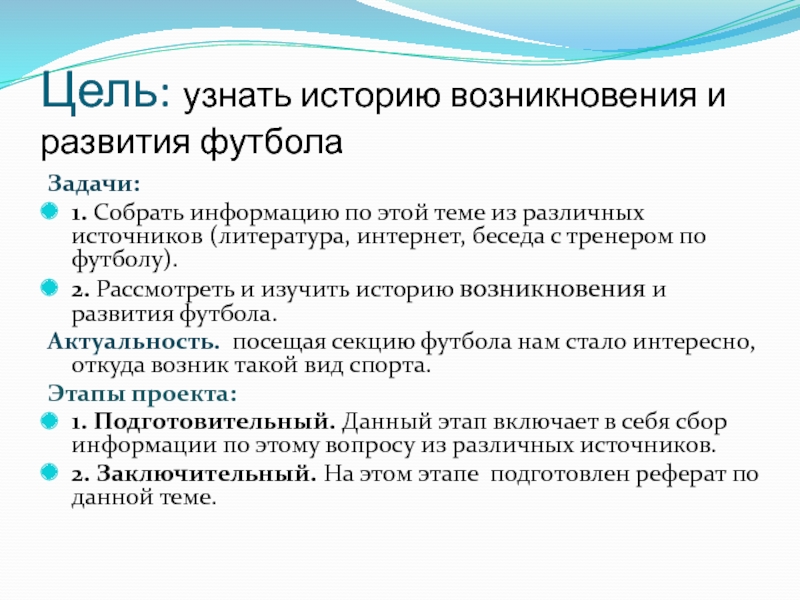 Цель: узнать историю возникновения и развития футболаЗадачи:1. Собрать информацию по этой теме из различных источников (литература, интернет, беседа с тренером по футболу).2. Рассмотреть и изучить историю возникновения и развития футбола.Актуальность. посещая секцию футбола нам стало интересно,