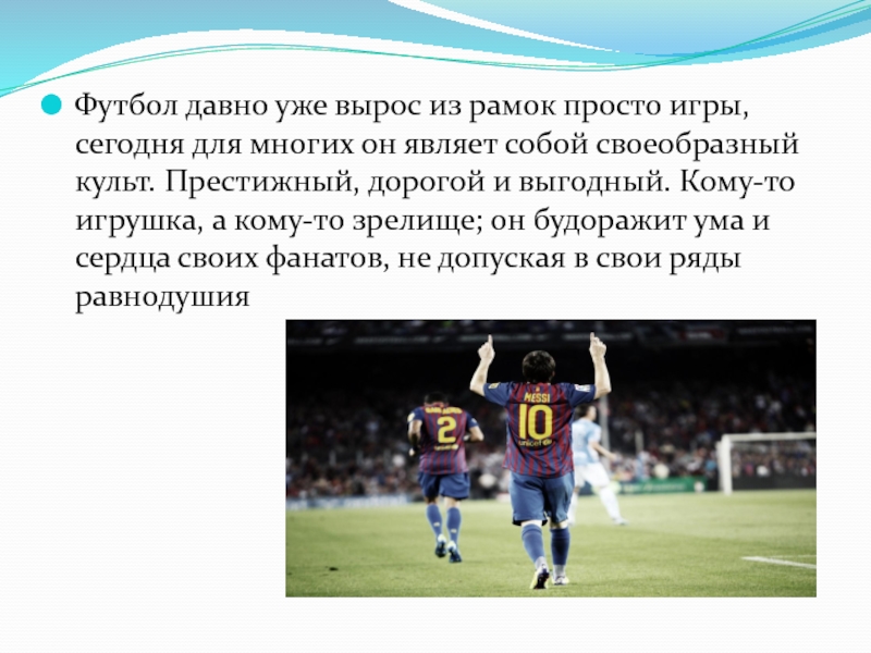 Слайд 8Футбол давно уже вырос из рамок просто игры, сегодня для многих