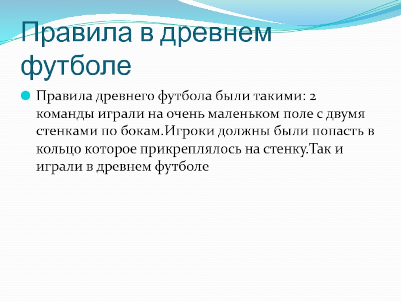 Правила в древнем футболеПравила древнего футбола были такими: 2 команды играли на очень маленьком поле с двумя