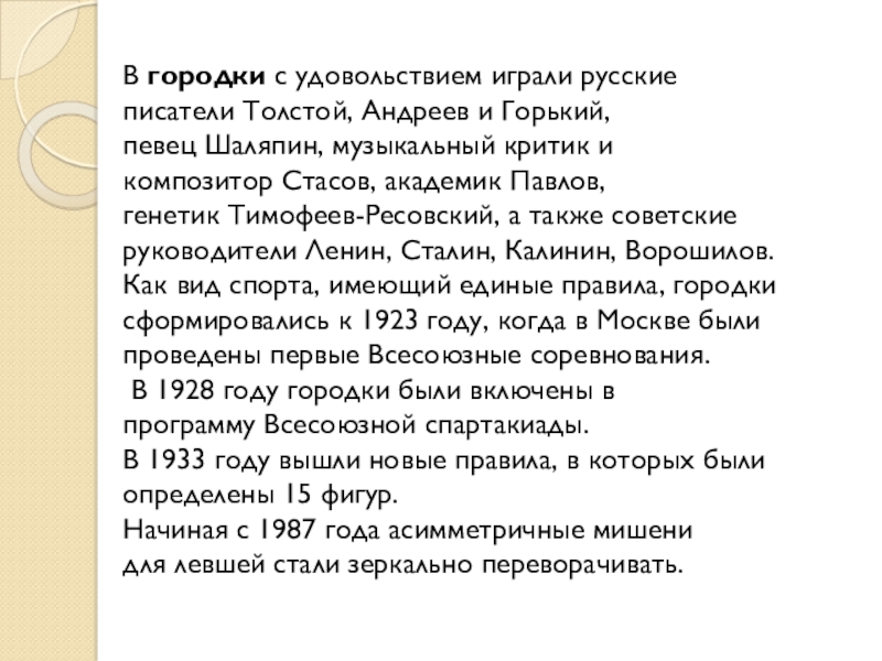 Слайд 4В городки с удовольствием играли русские писатели Толстой, Андреев и Горький, певец Шаляпин, музыкальный критик