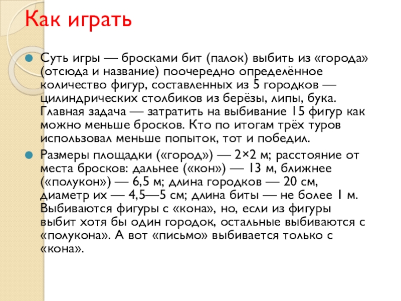 Суть игры — бросками бит (палок) выбить из «города» (отсюда и