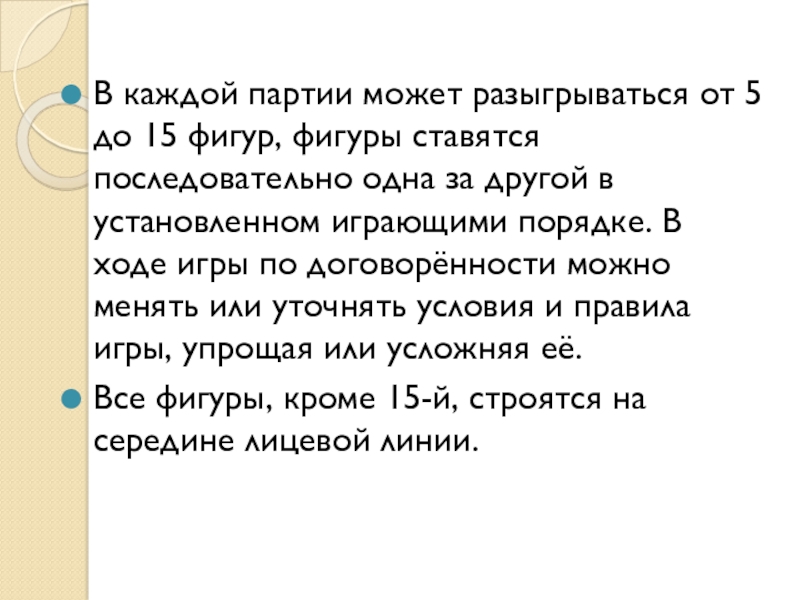 Слайд 10В каждой партии может разыгрываться от 5 до 15 фигур, фигуры
