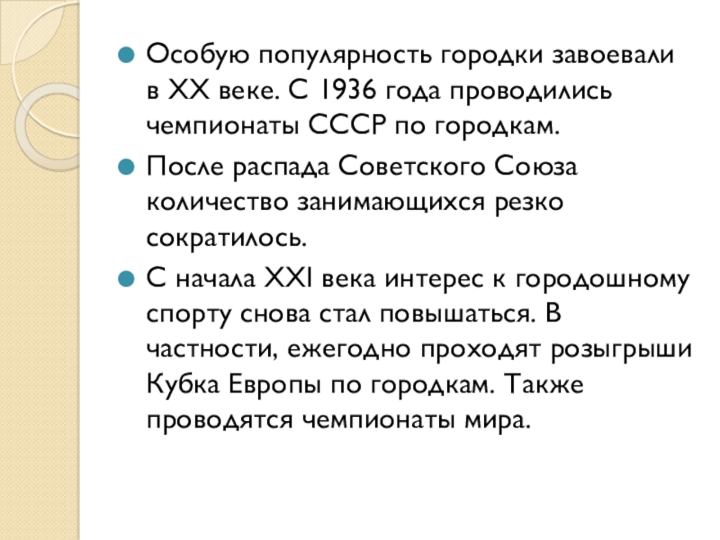 Слайд 5Особую популярность городки завоевали в XX веке. С 1936 года проводились