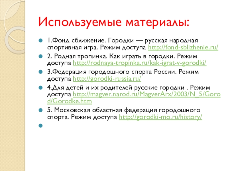 5. Московская областная федерация городошного спорта. Режим доступа http://gorodki-mo.ru/history/