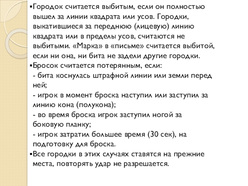 усов. Городки, выкатившиеся за переднюю (лицевую) линию квадрата или в пределы усов, считаются не выбитыми. «Марка» в «письме» считается выбитой, если ни она, ни бита не задели другие городки.