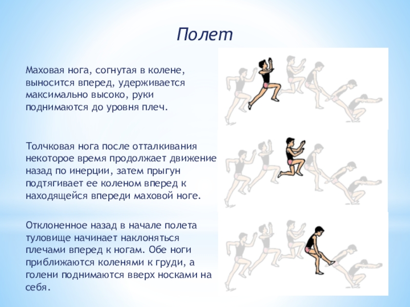 Толчковая нога после отталкивания некоторое время продолжает движение назад по инерции, затем прыгун подтягивает ее коленом вперед к находящейся впереди маховой ноге.