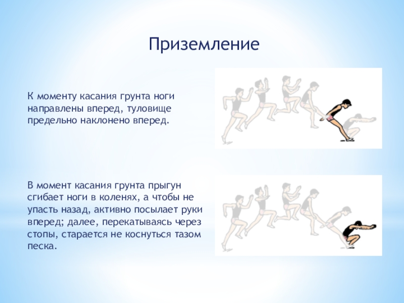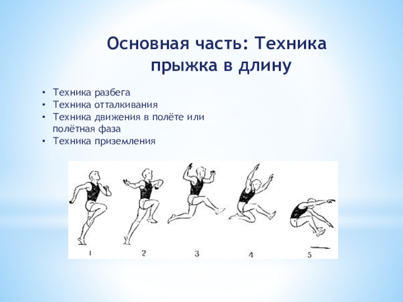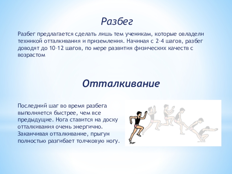 Последний шаг во время разбега выполняется быстрее, чем все предыдущие. Нога ставится на доску отталкивания очень энергично.