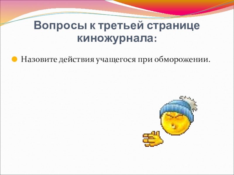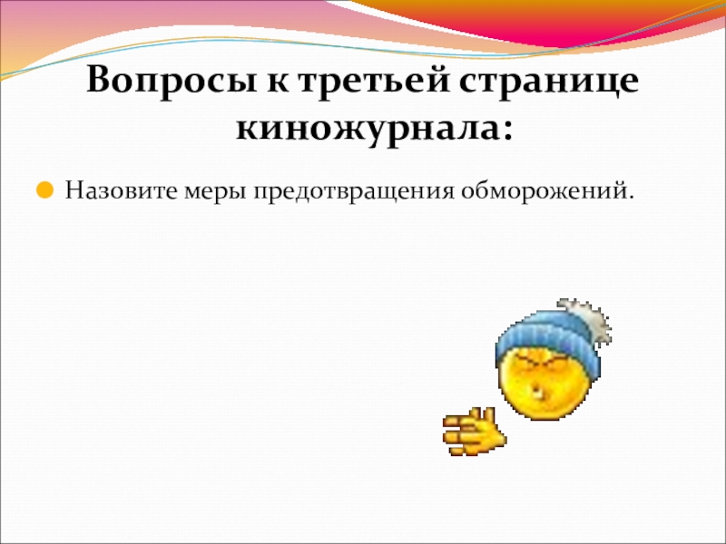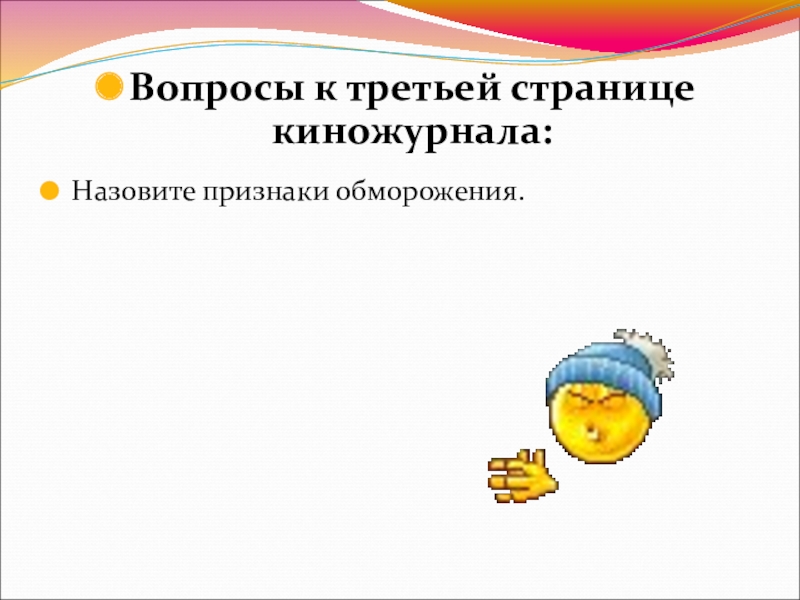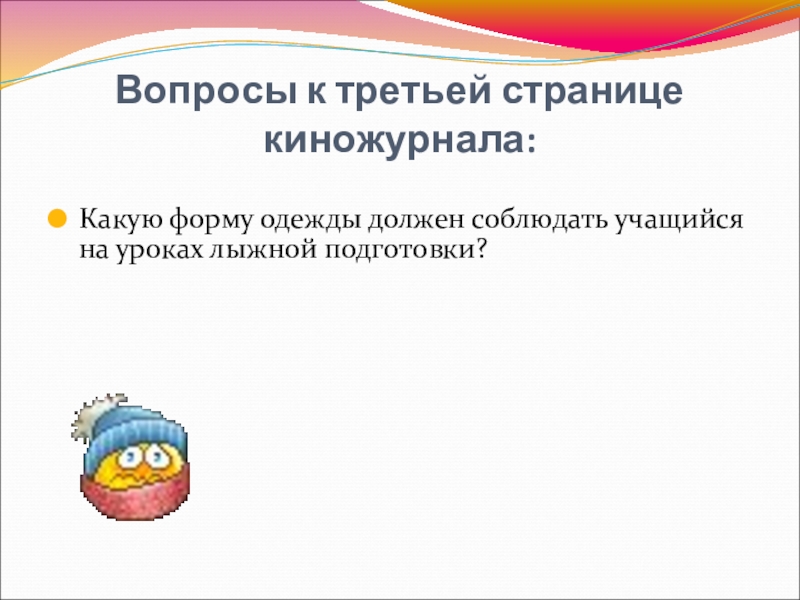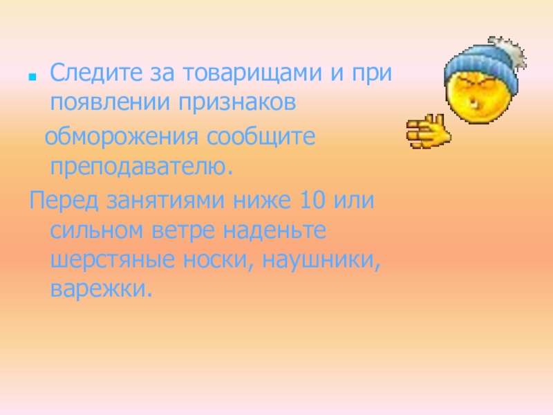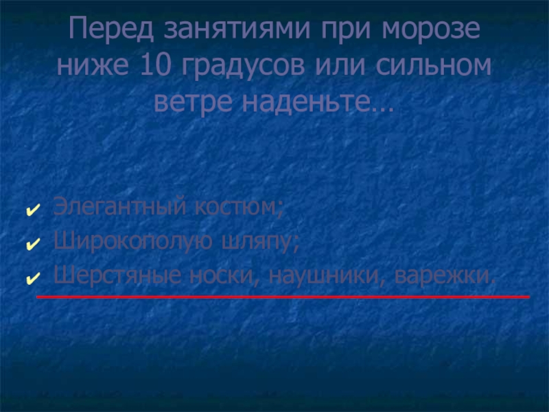 Слайд 61Перед занятиями при морозе ниже 10 градусов или сильном ветре наденьте…